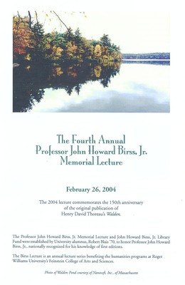 Buell, Lawrence, "Commemorating the 150th Anniversary of the Original Publication of Hnery Davod Thoreau's 'Walden"" (2004). John Howard Birss, Jr. Memorial Program. 4.